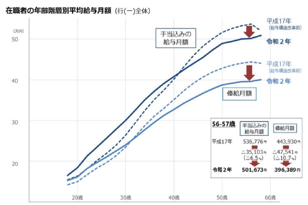 「分母が違うので単純には語れないよ」ということを先に申し添えたうえで話しますと、公務員給与は平均を取っているので、普通に生活しているだけだと生活水準は実質賃金くらいには下がっていってしまうと言えてしまうのです。