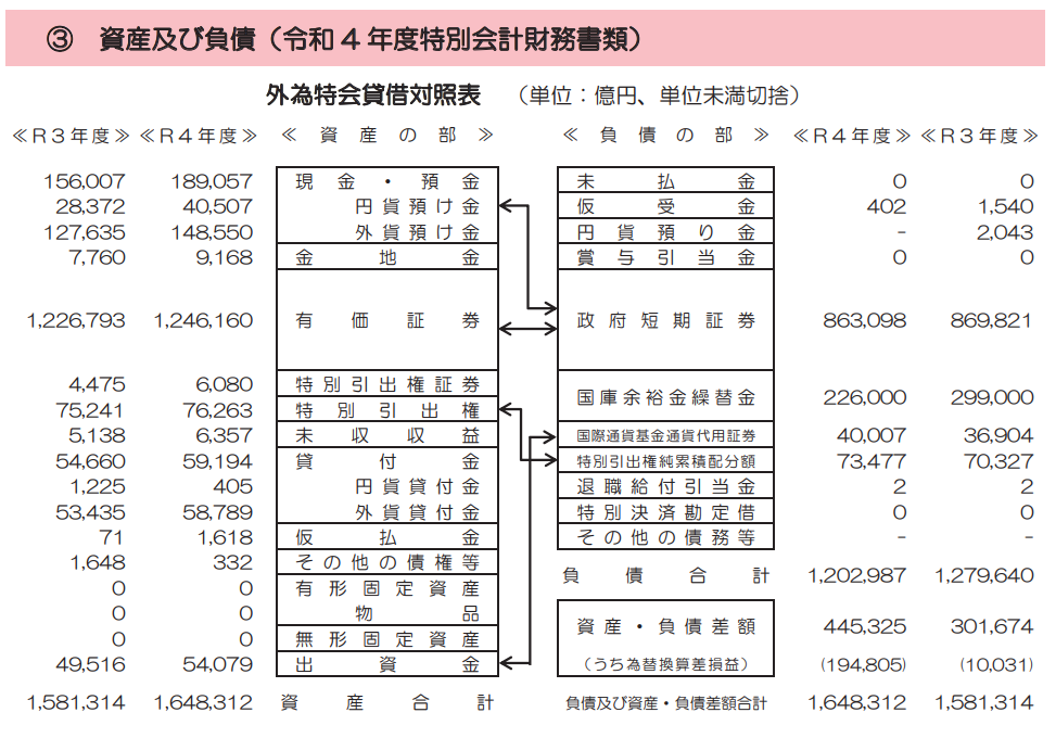 資産の状況を示す貸借対象表を見ると以下のとおりです。単位は億円なので、途方もない金額がこの特別会計の資産や負債額になっています。令和4年度決算データですが、その時点で資産と負債の差額は44兆5,325億円です。大きすぎてよく分からないですね。この金額は現在の円安による為替差益でさらに膨張しているため、「ホクホク」という表現になっているのです。